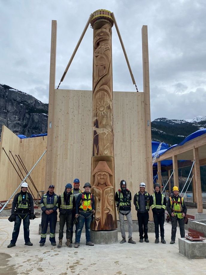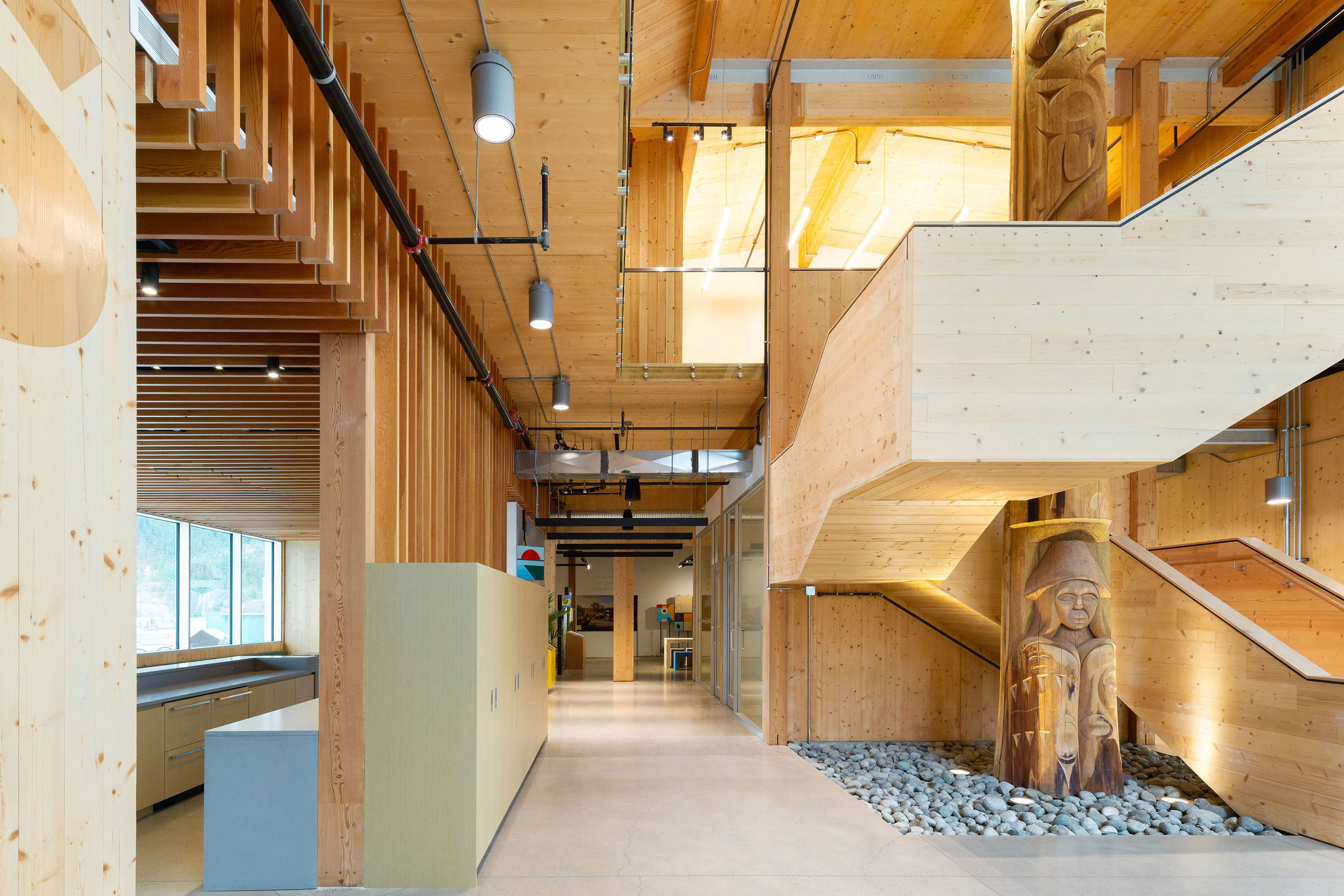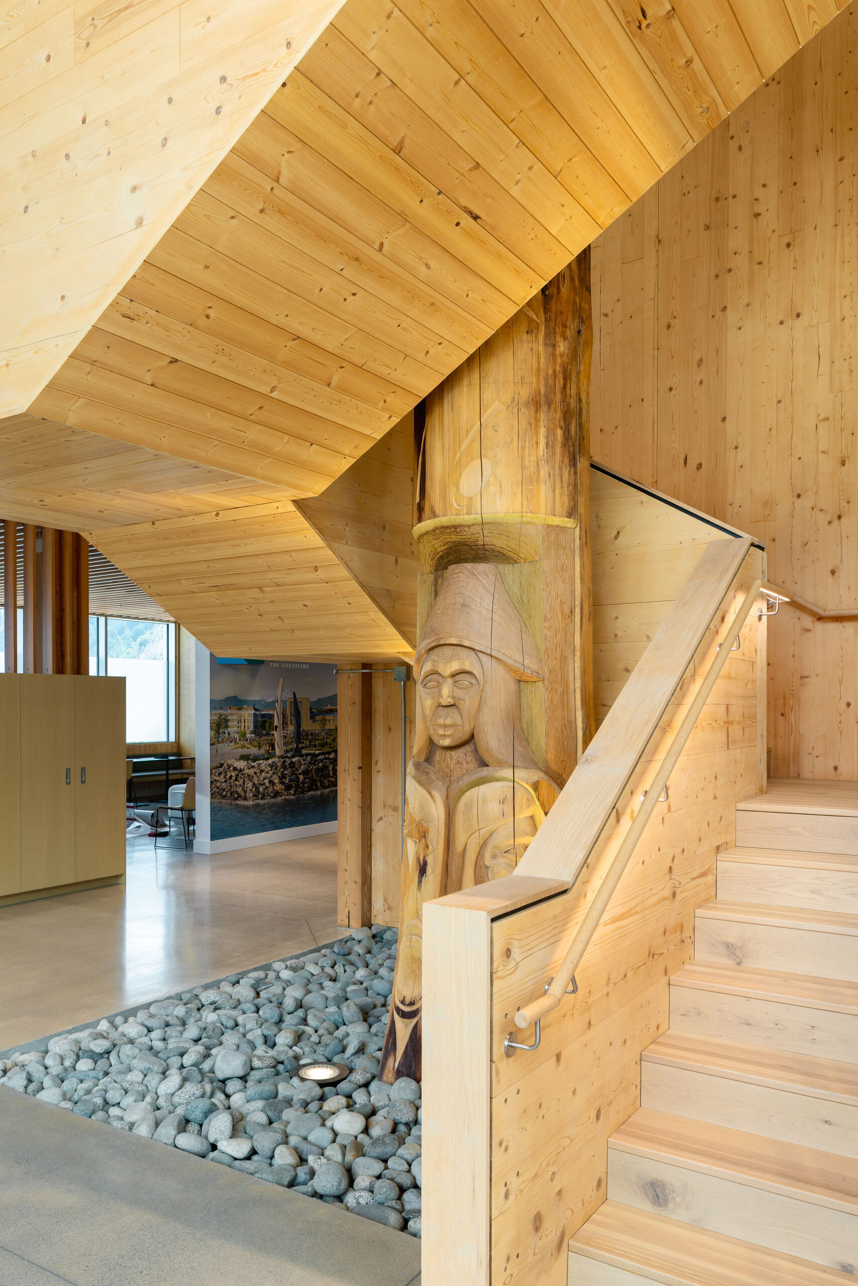 Anchoring the interior is a House Post carved by Xwalacktun (Rick) Harry. To honor Sḵwx̱wú7mesh Nation protocols, the post could not be mechanically penetrated. Our VDC team engineered a bespoke, non-penetrative wood collar and recessed rigging system, allowing for a culturally respectful installation that met all structural requirements.