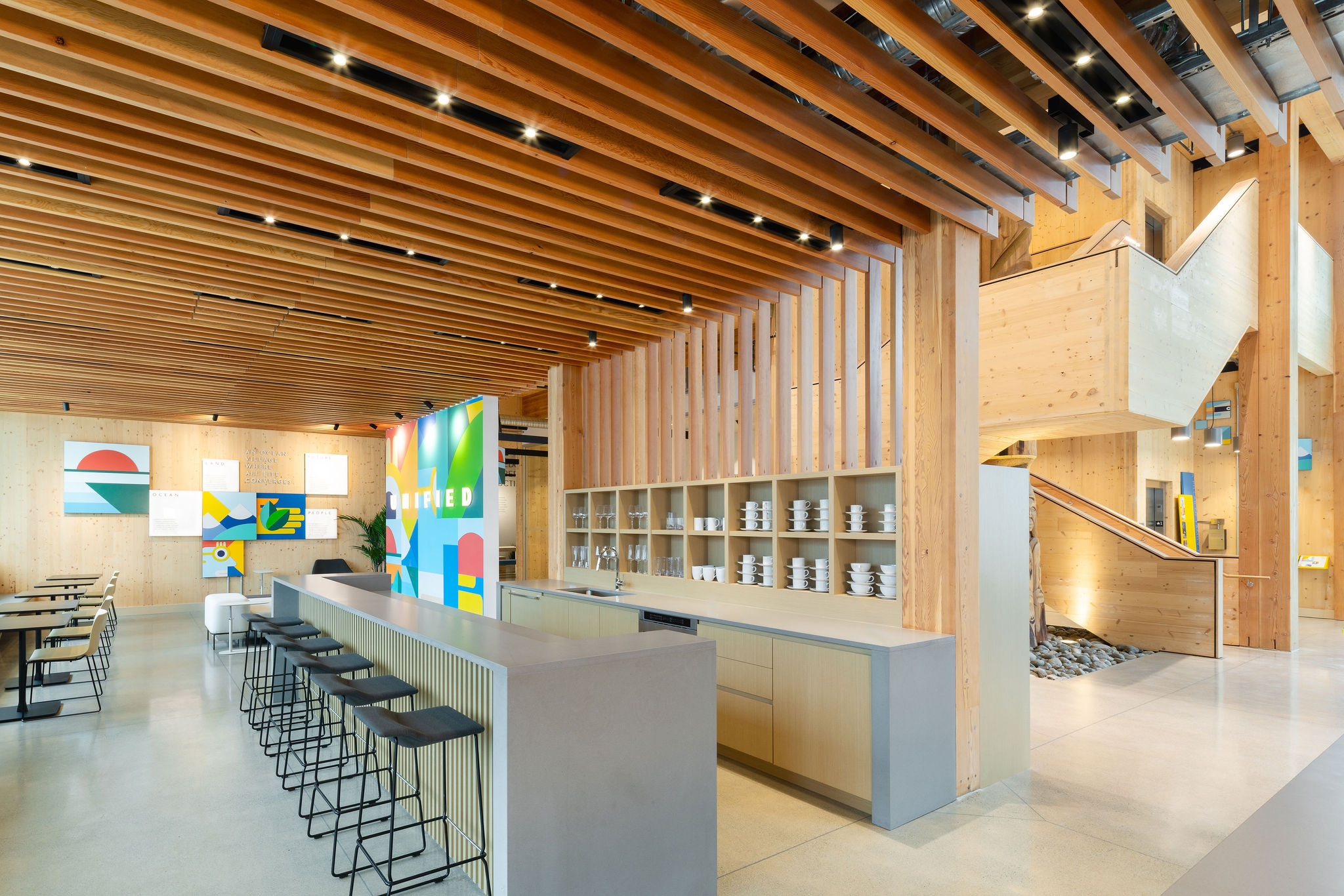 The structure is a showcase for British Columbia’s timber industry, sequestering 612 metric tons of CO₂ through 100% BC-sourced Douglas Fir Glulam and SPF (Spruce Pine Fir) CLT panels.